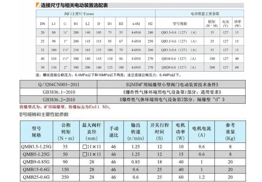 上海湖泉閥門集團有限公司礦用小口徑電動球閥是一種由球體旋轉而開閉水路的新型礦用隔爆型電動球閥(以下簡稱電動球閥),由于其適應的供水壓力范圍廣、不受泥沙、污水影響、供水通徑大、工作過程中通電時間短、工作穩(wěn)定可靠、是一種代用電磁閥的理想替代產品。 防爆型式:隔爆型;防爆標志:ExdⅠ,是一種由球體旋轉而開閉水路的新型礦用隔爆型電動球閥(以下簡稱電動球閥),由于其適應的供水壓力范圍廣、不受泥沙、污水影響、供水通徑大、工作過程中通電時間短、工作穩(wěn)定可靠、是一種代用電磁閥的理想替代產品。 防爆型式:隔爆型;防爆標志:ExdⅠ。 執(zhí)行標準:Q/ZLH07-2008、MT/715-1997標準。 正常工作條件: 電動閥應在下列條件下可靠的工作: 海拔高度不超過2000m; 環(huán)境大氣壓80-110kPa; 環(huán)境溫度-20-+40℃; 周圍空氣相對濕度不大于95%(25℃時); 具有甲烷混合物及煤塵爆炸危險的煤礦井下; 在無顯著振動的地方; 在無破壞金屬絕緣的氣體和蒸氣的環(huán)境; 在無滴水的地方。是一種由球體旋轉而開閉水路的新型電動閥門,它由數(shù)字邏輯控制電路,方向控制電路,電流采樣控制電路,工作狀態(tài)指示電路等組成;接入24VDC電源后,控制端K1、K2有繼電器無源點控制球閥的開啟與關閉,K1與K2短接球閥打開,K1與K2斷開球閥關閉。由電流采樣控制電路檢測球閥的工作位置, 工作狀態(tài)指示電路指示球閥的工作狀態(tài): 球閥旋轉開啟,綠色LED亮;當開啟到設定口徑時,黃燈亮(此時電機不耗電);當球閥旋轉關閉時,紅燈亮(此時電機不耗電)。 四.主要技術參數(shù) 1. 防爆標志: ExdⅠ 2. 輸入電壓: 24V DC. 3. 工作電流: ≤70mA DC. 4. 環(huán)境溫度: 0℃~40℃ 5. 環(huán)境濕度: ≤95%RH.(25℃時) 6. 大氣壓力: 80~110kPa 7. 水壓適應范圍 : 0.2MPa~7.0MPa。 8. 水溫適應范圍 : 0~60℃ 9. 球閥開啟速度 : 6s~12s 10。